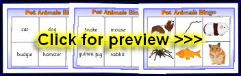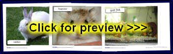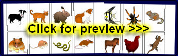 A set of printable picture cards featuring various pet animals. Also includes a set of smaller word cards for matching activities.