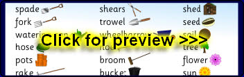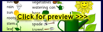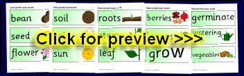 A printable word mat featuring words and pictures linked to plants and plant growth.