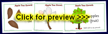 A set of printable flash cards showing the basic stages in the life cycle/growth of an apple tree.