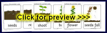 A set of printable flash cards showing the basic stages in the life cycle of a sunflower.