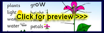 A simple word mat featuring words connected with plant growth, including a labelled diagram of a flowering plant.