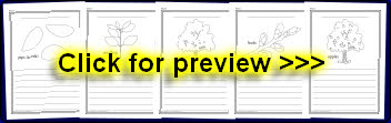 A set of simple printable sheets featuring images of apple tree growth for children to colour along with writing lines for topic-related writing.
