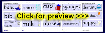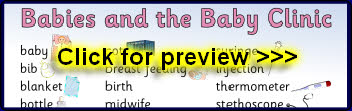 A printable set of words with accompanying pictures related to babies and a baby clinic. These are great for use as aids when children are writing, or for a baby clinic role-play situation.