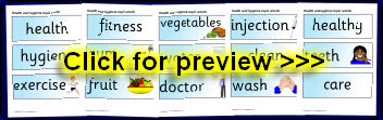 A set of printable word and picture cards linked to health and hygiene.