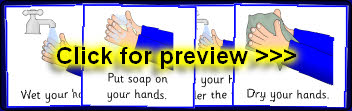 A set of picture cards showing the basic steps of washing your hands. Great for discussion and sequencing activities.
