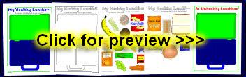 A printable lunchbox with healthy and non-healthy foods for children to cut and stick.