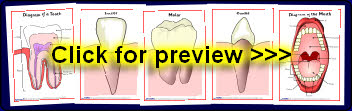 6 simple posters showing different types of teeth and diagrams of a tooth and the mouth.