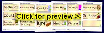 A set of 17 printable cards with words and pictures linked to the Anglo-Saxons.