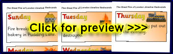 Very simple flash cards with the key daily events of the Great Fire of London from Sunday through to Thursday when the fire was put out.