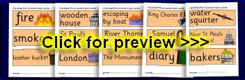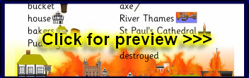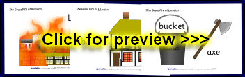 A simple set of 6 A4 sheets showing pictures and words linked to the Great Fire of London.