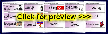 A set of printable topic word cards with pictures linked to the Florence Nightingale.
