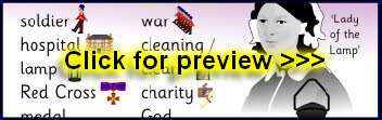 A printable word mat featuring words and pictures linked to the work of Florence Nightingale. Ideal for children to use as prompts when writing.