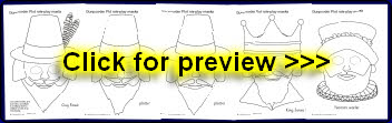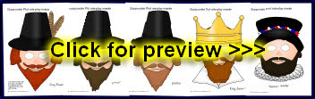 A set of printable role-play masks featuring key characters in the Gunpowder Plot. Includes Guy Fawkes and two of his supporters, King James, Yeoman warder and a soldier.