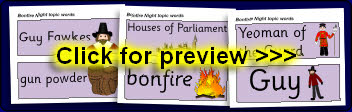 A set of printable topic words for 5th November. Includes Guy Fawkes and the Houses of Parliament, together with bonfire, fireworks and others.