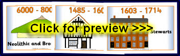 A group of A4 printable posters featuring simple pictures of various homes present and past. Includes houses from the main periods in British history.