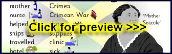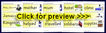 A set of printable word and picture cards linked to the life of Mary Seacole. Ideal for a topic word bank or to use on classroom display.