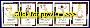 A great set of colourful posters showing 11 of the most well-known Roman Gods. Includes the gods linked to the days of the week such as Mars (god of war), Venus (goddess of love) and Apollo (God of the sun).