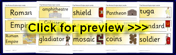 A useful set of printable cards featuring words and pictures relating to the Roman Empire. Useful for topic word banks, classroom displays and for topic discussion. Includes 36 different cards.