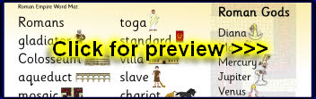 A printable word mat featuring words and pictures linked to the ancient Romans.