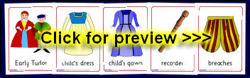 A useful set of 21 pictures (with words) linked to the Tudors. Includes common clothing from the time and other everyday items. These are ideal for use to stimulate discussion and for use on classroom displays about the Tudors too.