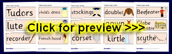 A useful set of 24 words and pictures linked to the Tudors. Includes common clothing from the time and other everyday items. These are great for use in topic word banks or for use on displays about the Tudors.