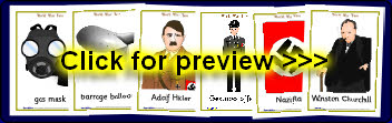 A useful set of 24 A4-sized pictures with words for a topic on World War Two. Includes words such as ‘air raid shelter’, ‘gas mask’, ‘Adolf Hitler’, ‘soldier’, ‘medal’ and many more. These are ideal for topic discussion and classroom displays.