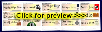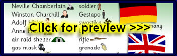 A useful set of 29 words, most with pictures, for a topic on World War Two. Includes words such as ‘air raid shelter’, ‘gas mask’, ‘Adolf Hitler’, ‘soldier’, ‘medal’ and many more. These are ideal for topic discussion, classroom displays or for use as part of a word bank.
