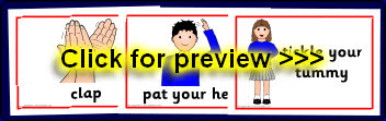 Set of printable visual aids with various body actions that your class can perform such as clapping, jumping, stamping, yawning, sneezing etc. Includes picture-only version.