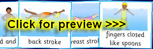 A set of printable resources for use when teaching swimming, or for displaying in your school swimming pool. Includes illustrated activity/challenge cards such as ‘get your face wet’, ‘bob up and down’, ‘back stroke’, ‘go under water’ etc. together with posters that include swimming items as well as actions.