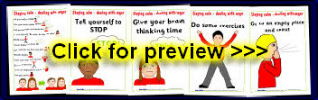 A set of posters with tips for staying calm and dealing with anger. Includes a summary sheet and illustrations.