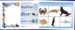A useful printable set of 27 words, most with pictures, linked to an ‘under the sea’ topic. These are great as topic discussion aids or for use in a topic word bank. They would also look great as labels on an ‘under the sea’ classroom display.