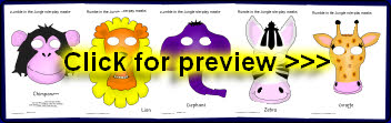 Simple printable masks featuring various fun jungle animals. An ideal accompaniment to work on ‘Rumble in the Jungle’ by Giles Andreae and David Wojtowycz.