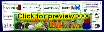 A set of resources for a classroom ‘Jungle Explorers’ role-play area. It includes a banner, labels with pictures, explorer badges, animal observation form and sketch pad template.