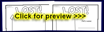 Printable writing frames for lost pet posters. With space to write the pet’s name, type of animal, description and phone number, together with a drawing of the pet.