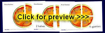 A set of printable visual aids to help explain basic fractions to your class. The pizza is cut into quarters and halves.