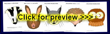 Simple printable masks for use in role-play or for retelling a story. Simply cut out the eyes and attach a lollipop stick as a handle.