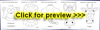 Simple printable masks featuring various fun jungle animals. An ideal accompaniment to work on ‘Rumble in the Jungle’ by Giles Andreae and David Wojtowycz.