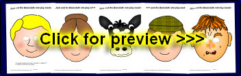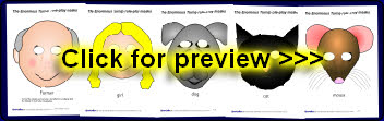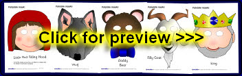 Simple printable masks for use in role-play or for retelling the story. Simply cut out the eyes and attach a lollipop stick as a handle.