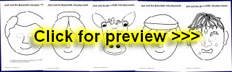 A great set of printable masks for role-playing or performing the story of Jack and the Beanstalk. Simply print them out on card/laminate, cut out the eyes and stick on a lollipop stick and your children will love acting out the story.