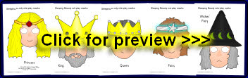 A great set of printable masks for role-playing or performing the story of Sleeping Beauty. Simply print them out on card/laminate, cut out the eyes and stick on a lollipop stick and your children will love acting out the story.
