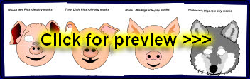Simple printable masks featuring characters from the Three Little Pigs story.