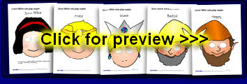 A useful set of printable masks for role-play featuring a selection of well-known fairy tale characters. Simply print them out, cut out the eyes and stick on a lollipop stick and your children will love acting out scenarios as their favourite characters.