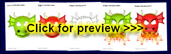 Simple printable masks for use in role-play or for retelling a story. Simply cut out the eyes and attach a lollipop stick as a handle. Includes colour and black and white versions, friendly and fierce dragons.