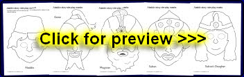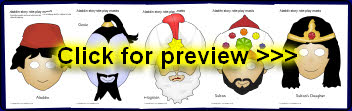 A set of printable cut-out masks for role-playing the story of Aladdin. Simply cut out the eye-holes, laminate and attach to a stick for children’s role-play or to retell the story.
