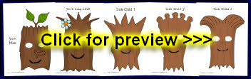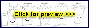 Simple printable masks featuring Stick Man, Stick Lady Love and their three children.