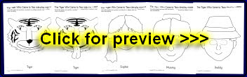 Simple printable masks featuring the main characters from The Tiger Who Came to Tea by Judith Kerr.