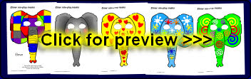 Simple printable masks featuring a patchwork elephant, grey elephant and 5 other patterned elephants. An ideal accompaniment to work on Elmer the Elephant by David McKee.