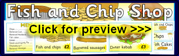 A set of printable resources for your Fish and Chip Shop role-play area. Includes banners, food posters, labels and more.