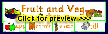 A very useful set of printable resources for use in your Fruit and Vegetable Shop role-play area. Includes a resizable banner image, signs and labels as well as printable cheque books, shopping lists and price tags.