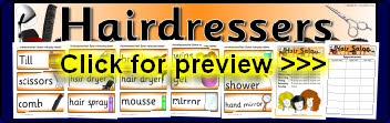 A set of printable resources to use in your Hairdressers/Hair Salon role-play area. It includes banners, labels, appointment sheets, signs and opening times. Inspire your class with this much-requested role-play pack.